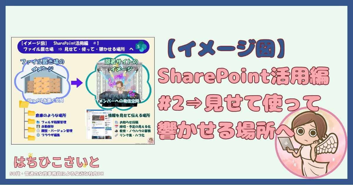 図解ギャラリー 【図解】SharePoint活用編#2 ファイル置き場 ⇒ 見せて・使って・響かせる場所へ はちひこ 2025年1月29日 / 2025年10月19日 📘 PDFを開く 🔗 記事リンク 【SharePoint活用編 #2】SharePointの部署ポータル構成を示した図。ファイル保管場所を情報共有サイトとして活用する仕組みを説明したイメージ。