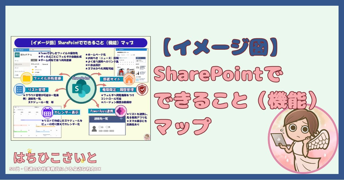 図解ギャラリー 【図解】SharePointでできること(機能)マップ はちひこ 2025年1月29日 / 2025年10月19日 📘 PDFを開く 🔗 記事リンク SharePointって何ができるの?ファイル共有、社内ポータル、ニュース投稿、スケジュール管理、アプリ化まで機能を一枚で整理しました